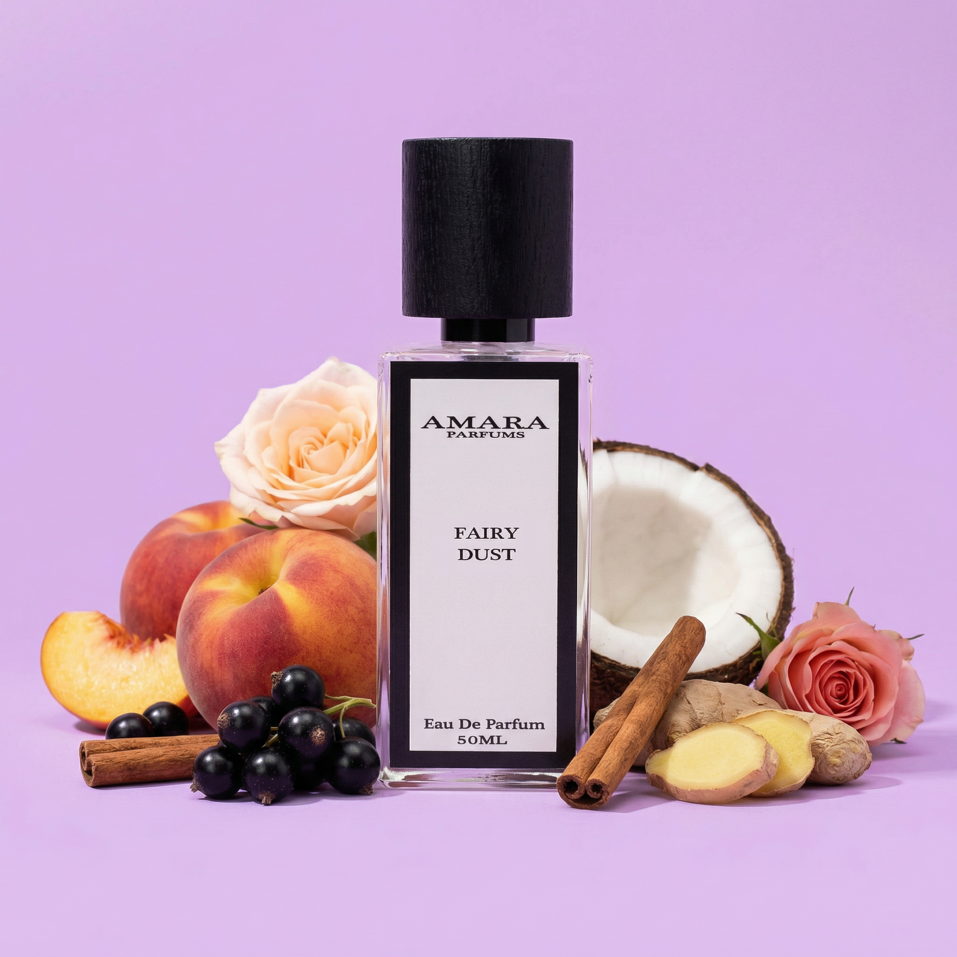 Fairy Dust is radiant, modern, feminine, and quietly magnetic. It opens with a vibrant mix of peach, black currant, ginger, and cinnamon that feels fruity, warm, and full of energy. The heart blooms into a luminous bouquet of rose, Bulgarian rose, lily of the valley, violet, and soft coconut milk, giving it a floral softness with a creamy edge. As it settles, ambroxan and patchouli create a smooth, sensual finish that feels polished, elegant, and long-lasting.